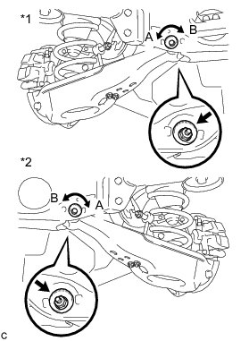 (1) If the toe-in measurement is greater than the specified range, extend the shorter rear No. 2 suspension arm assembly by rotating the adjust cams in the direction of arrow B in the illustration.