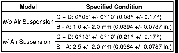 Camber is not adjustable. If the measurement is not within the specified range, inspect the suspension parts for damage and/or wear, and replace them if necessary.
