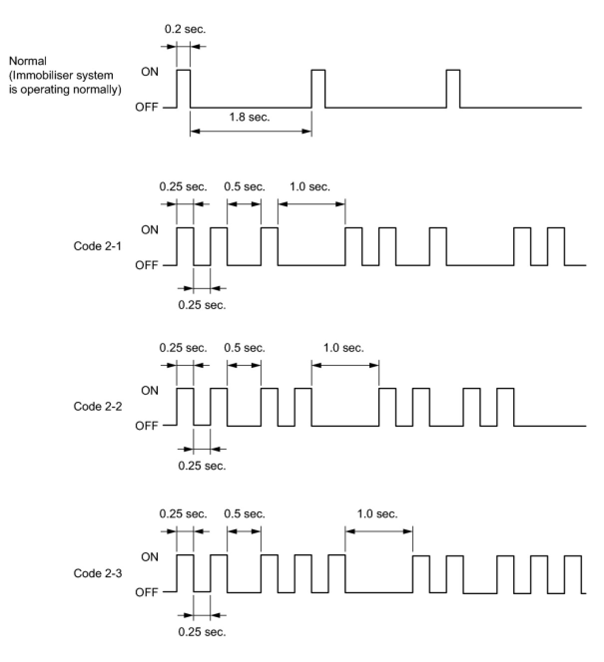 * If the key code registration has failed in automatic key code registration mode, code 2-1 will be output from the security indicator light. Trying to reregister an already registered key will cause code 2-2 to be output when the key is inserted. If the number of registered key codes exceeds the limit, code 2-3 will be output from the security indicator light. The output details are shown below.