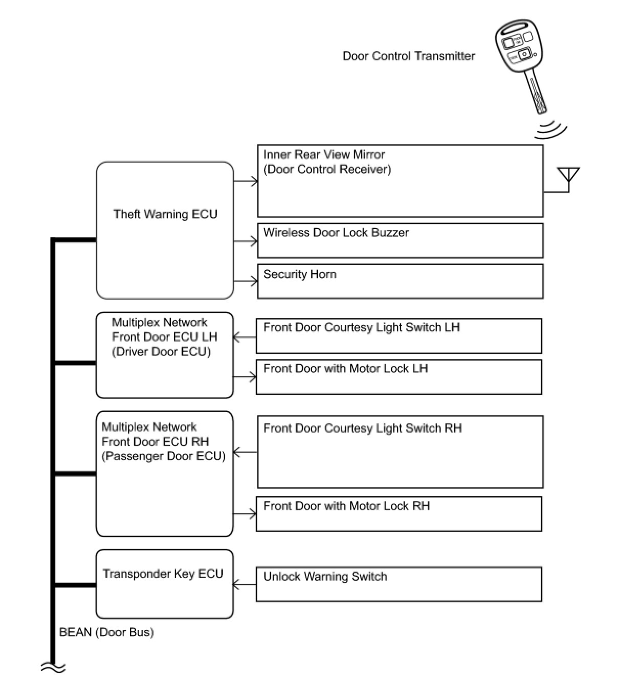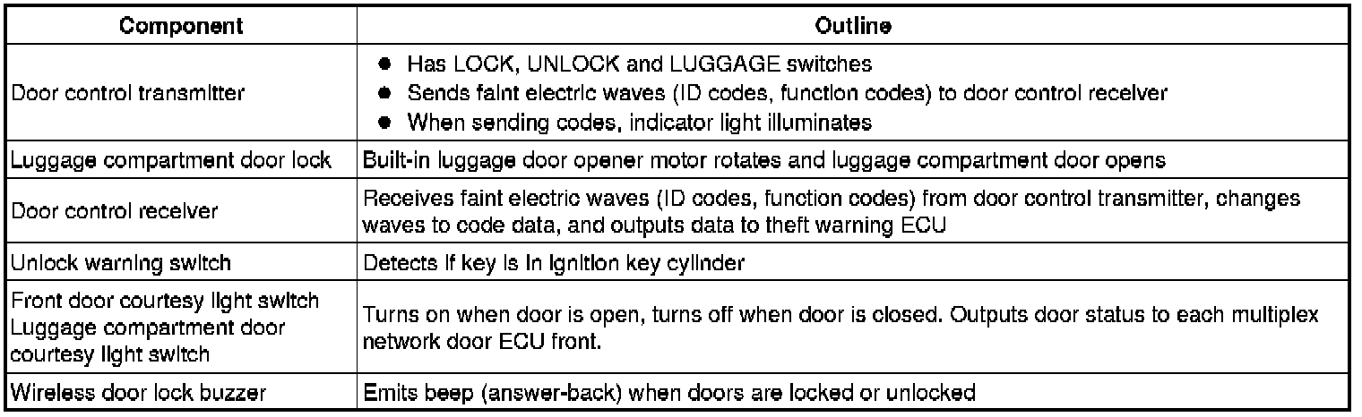 (1) The door control receiver performs the code identification process and the theft warning ECU (theft warning ECU) operates the door lock control. A serial data link is provided for communication between the door control receiver and the theft warning ECU.