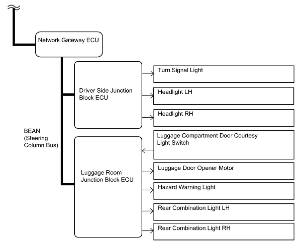 (1) With the unlock warning switch OFF, press the door control transmitter's LUGGAGE switch. Similar to the door lock /unlock operation, the following occurs: 1) the theft warning ECU receives the LUGGAGE switch signals through the serial communication line; 2) it sends the luggage compartment door open control signals to the luggage room junction block ECU through the multiplex communication line; and 3) the luggage door opener motor will open the luggage compartment door. Also, the luggage compartment door courtesy light turns on.