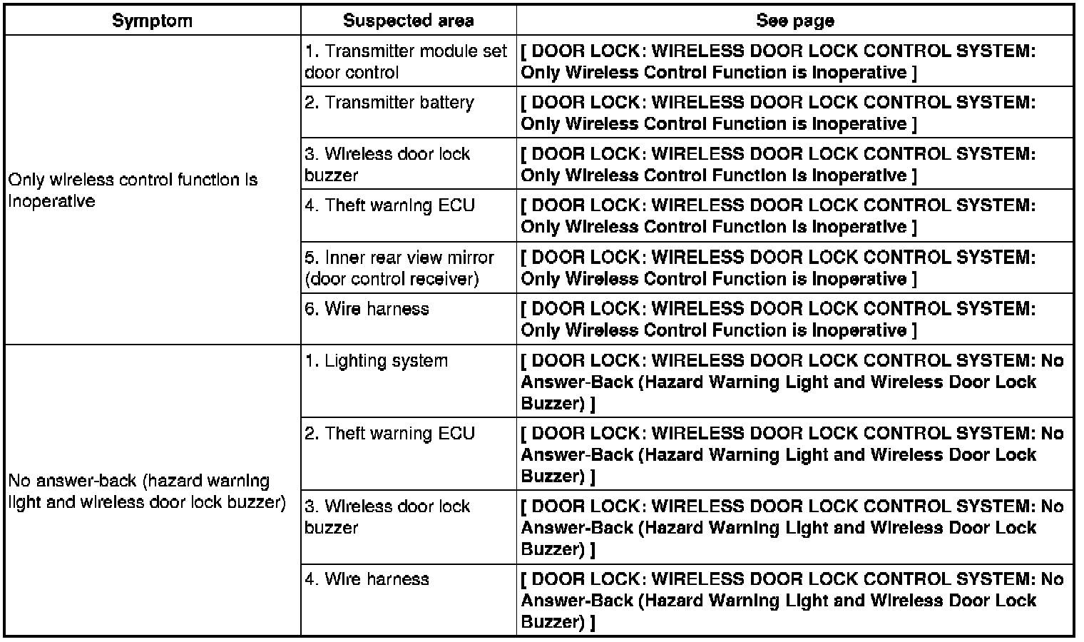 DOOR LOCK: WIRELESS DOOR LOCK CONTROL SYSTEM: PROBLEM SYMPTOMS TABLE