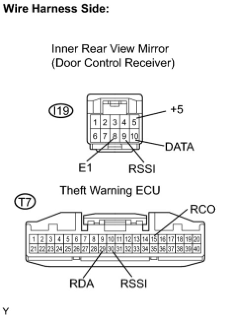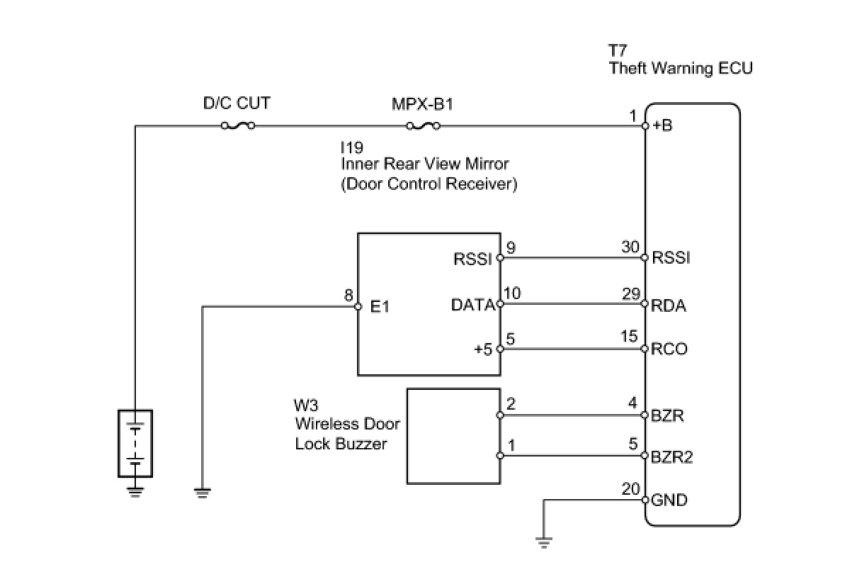 The signal from the transmitter is input to the theft warning ECU through the RDA line. The status of the RDA and RSSI lines are diagnosed by the theft warning ECU. If the wireless door lock control system fails, check for DTCs to confirm if the cause is the RDA and/or RSSI line.