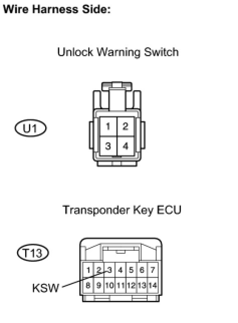 The transponder key ECU uses the unlock warning switch to detect when the key is in the ignition key cylinder, and transmits the detection as a signal to the theft warning ECU. When the door is locked with the ignition switch OFF and the key in the ignition key cylinder, the theft warning ECU transmits the LOCK signal. Then the UNLOCK signal is sent to the multiplex network door ECU front LH and RH. After those operations, the multiplex network front door ECU LH and RH drive the door lock motor.