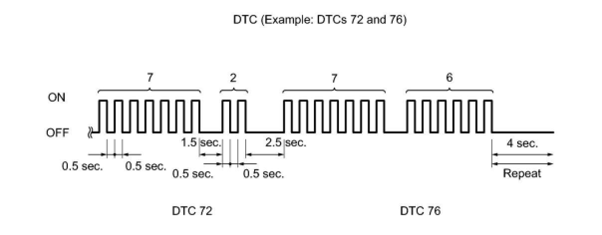 * As an example, the blinking patterns for trouble codes 72 and 76 are shown below.