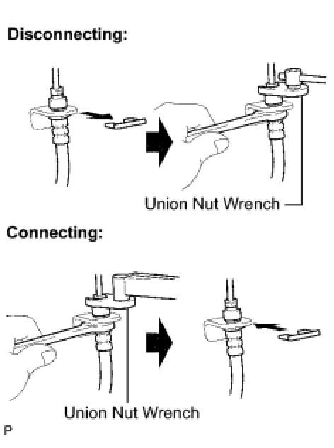 * Hold the flexible hose with a wrench. Using union nut wrench, disconnect the brake tube without deforming the tube.