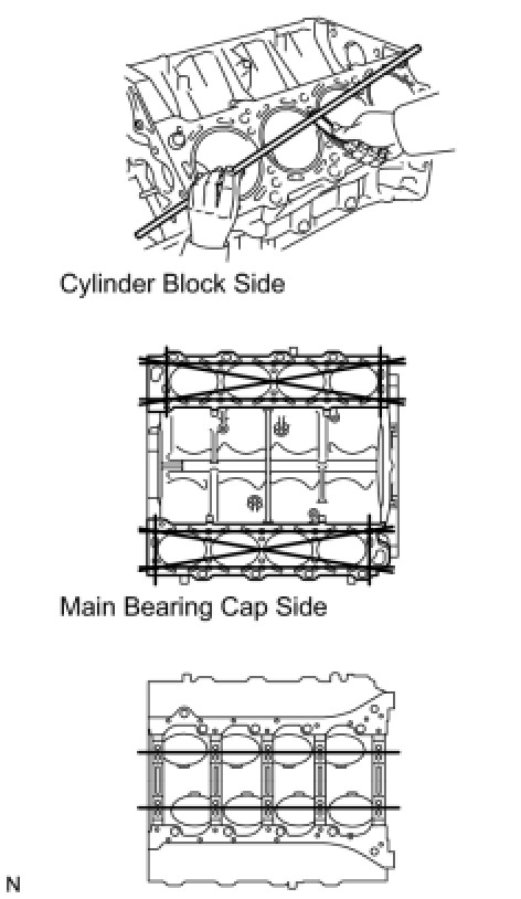 (1) Using a precision straightedge and feeler gauge, measure the surfaces contacting the cylinder head and main bearing cap for warpage.