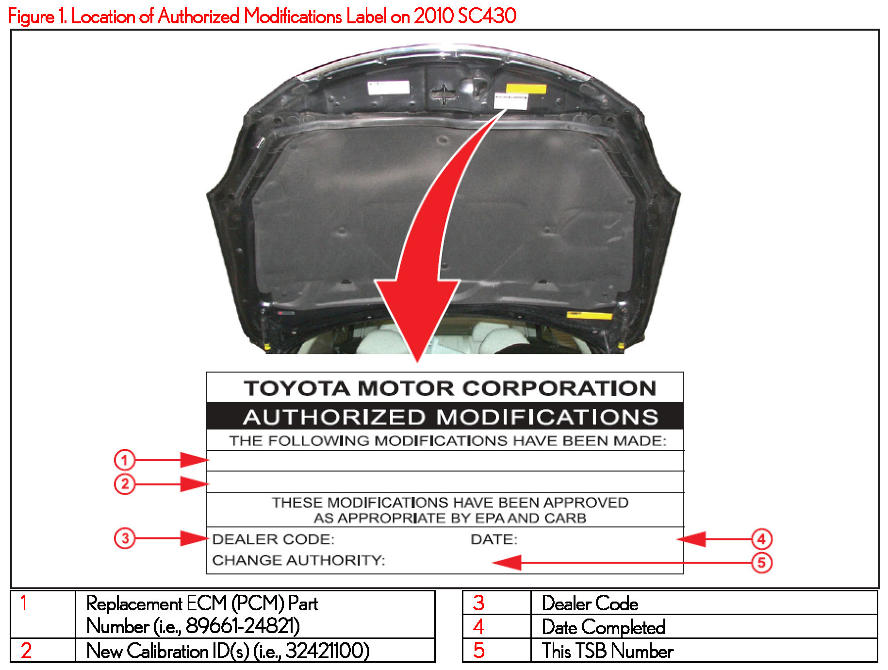 2. Check for the Authorized Modifications Label affixed to the vehicle in the location shown in Figure 1. Confirm if the ECM (PCM) calibration has been updated. If the calibration ID listed is NOT the latest ECM (PCM) calibration - go to step 3.