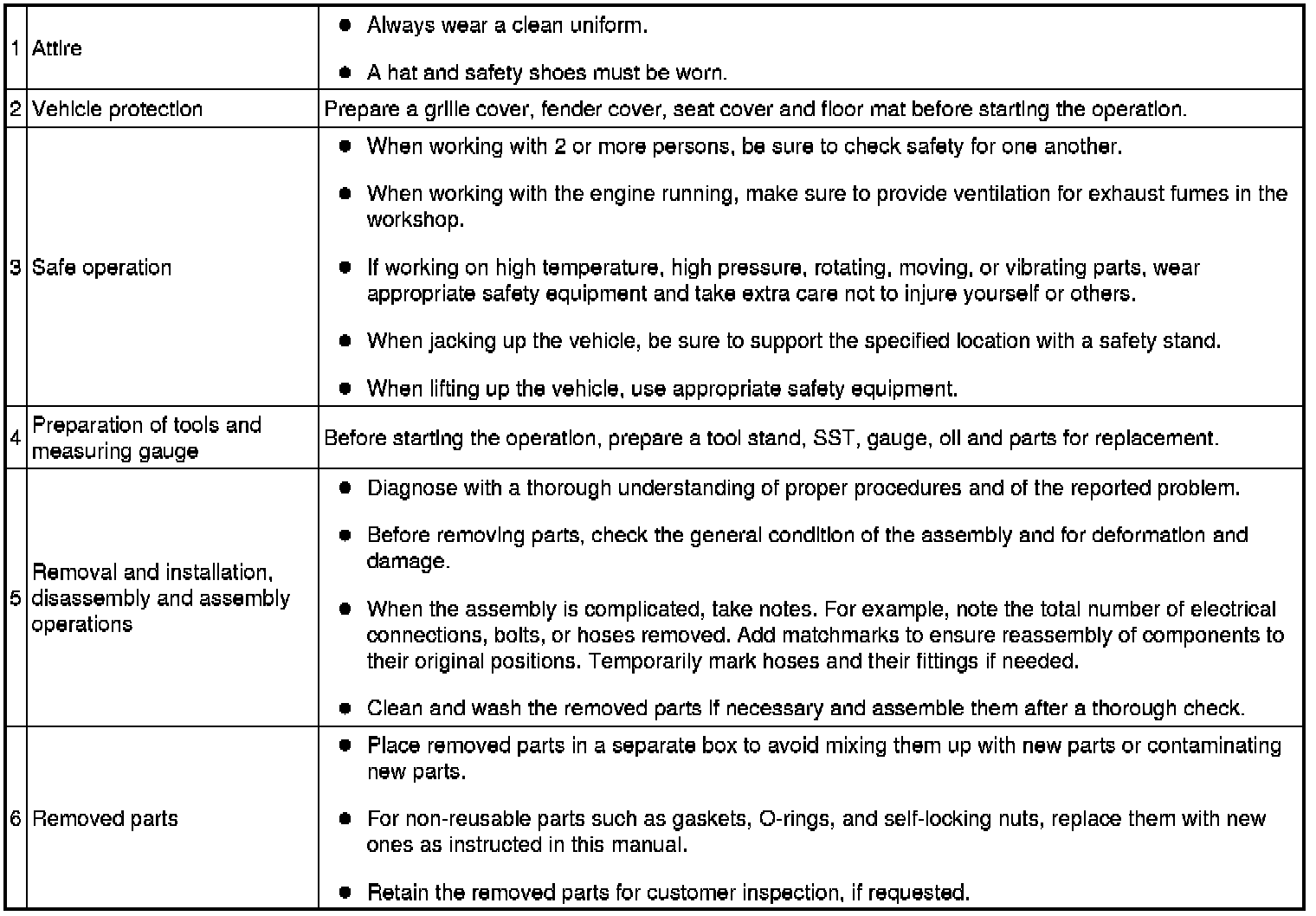 * Failure to carry out service procedures in the correct sequence could cause SRS parts to unexpectedly deploy and possibly lead to serious injuries. Furthermore, if a mistake is made when servicing SRS parts, they may fail to operate when required. Before performing servicing (including installation/removal, inspection and replacement of parts), be sure to read the following precautions.