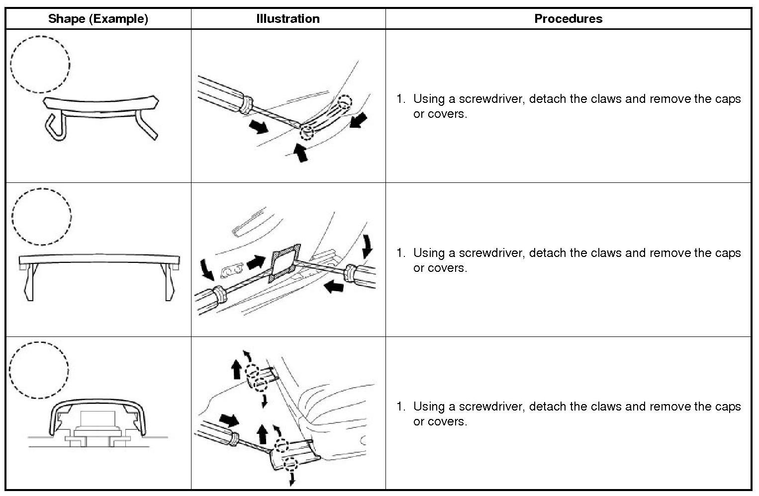 (1) The removal and installation methods of typical claws used for vehicle body parts are shown in the table below.