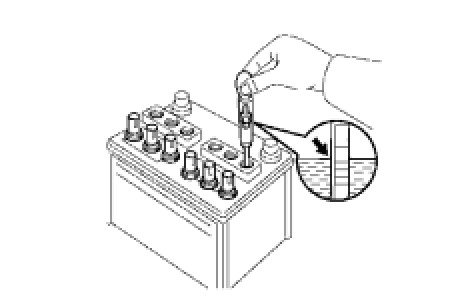 (2) If the electrolyte quantity is below the lower line, check the battery voltage when cranking the engine. If the voltage is less than 9.6 V, recharge or replace the battery.