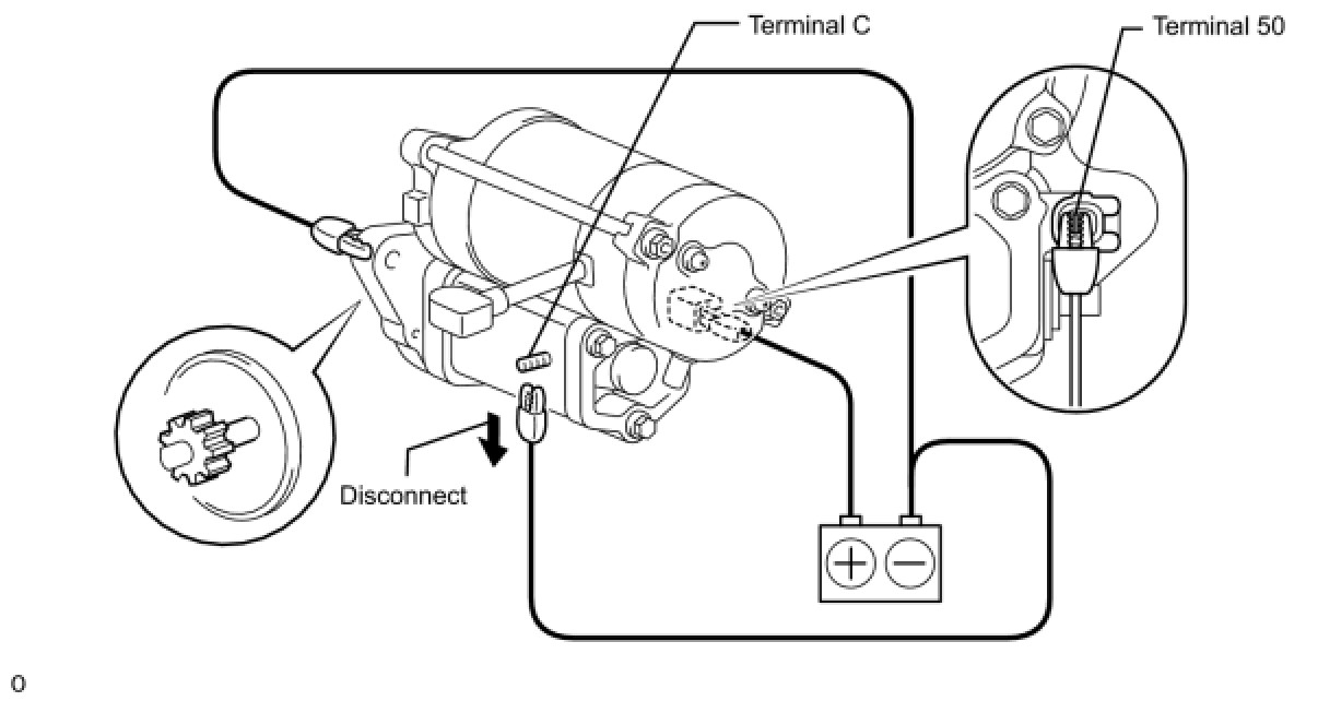(3) With the battery connected as above and the clutch pinion gear out, disconnect the negative (-) lead from terminal C. Check that the pinion gear remains out.