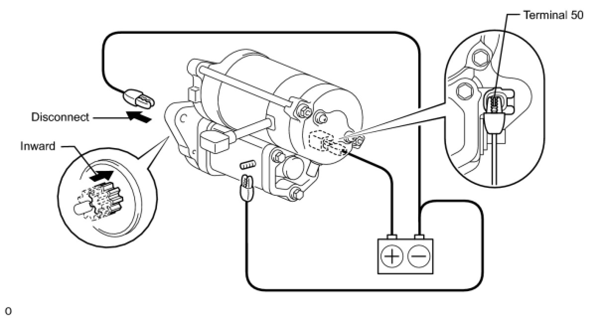 (2) Connect the battery to the magnetic switch as shown in the illustration. Then check that the clutch pinion gear moves outward.