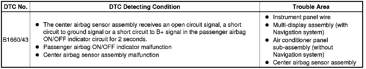 DTC B1660/43 is stored when a malfunction is detected in the passenger airbag ON/OFF indicator circuit.