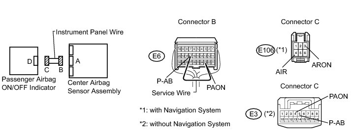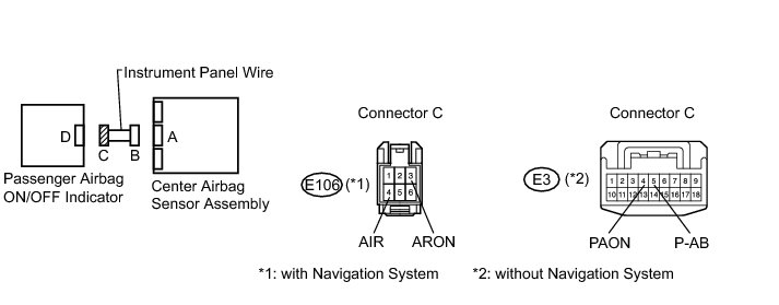 The passenger airbag ON/OFF indicator circuit consists of the center airbag sensor assembly and the passenger airbag ON/OFF indicator.