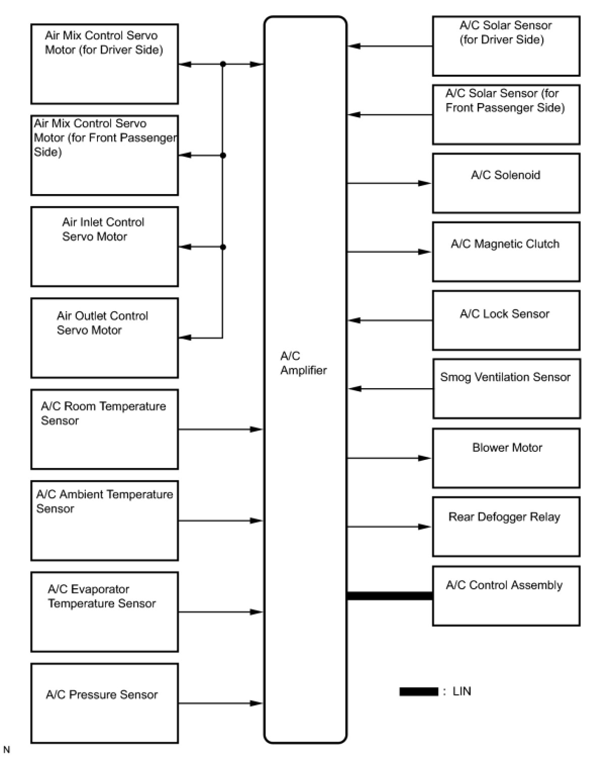 (b) A solar sensor detects (in the form of changes in the current that flows through the built-in photo diode) the changes in the amount of sunlight from the LH and RH sides (2 directions) and outputs these sunlight strength signals to the A/C amplifier.