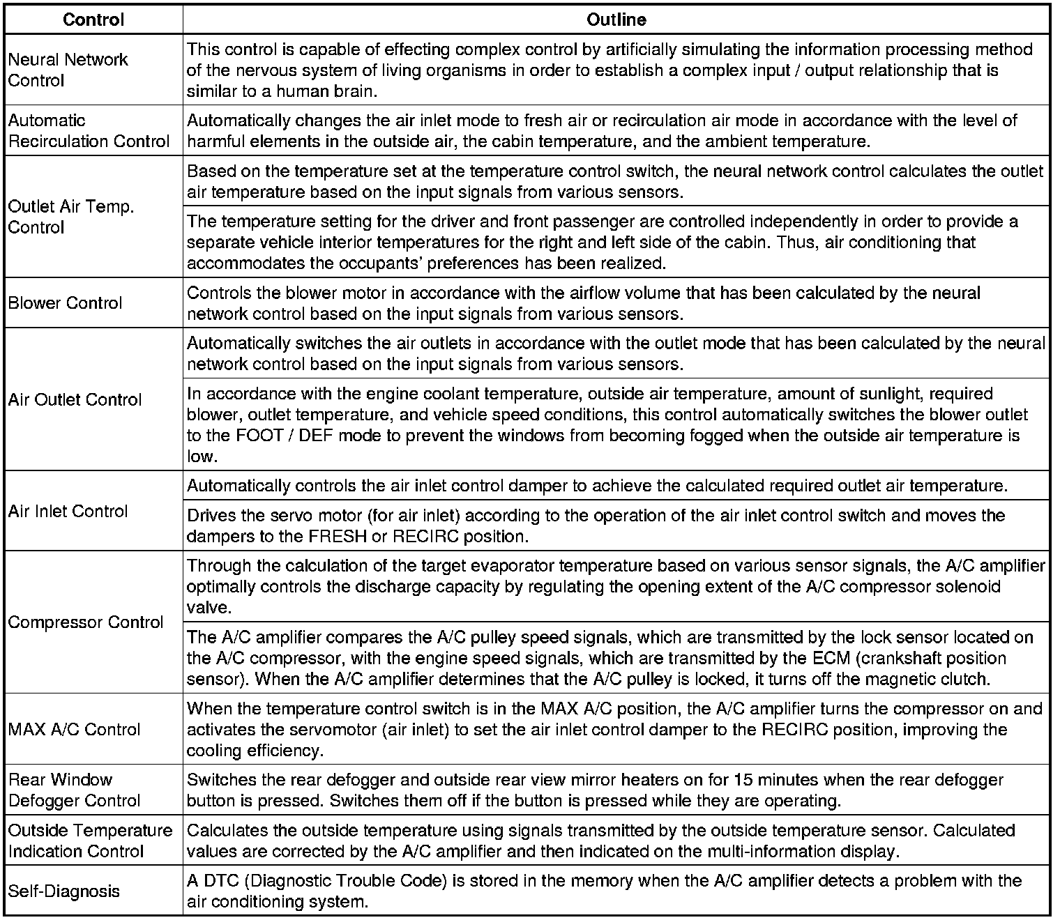 * However, because the senses of a person are rather complex, a given temperature is sensed differently, depending on the environment in which the person is situated. For example, a given amount of solar radiation can feel comfortably warm in a cold climate, or extremely uncomfortable in a hot climate. Therefore, as a technique for effecting a higher level of control, a neural network has been adopted in the automatic air conditioning system. With this technique, the data that has been collected under varying environmental conditions is stored in the A/C amplifier. The A/C amplifier can then effect control to provide enhanced air conditioning comfort.