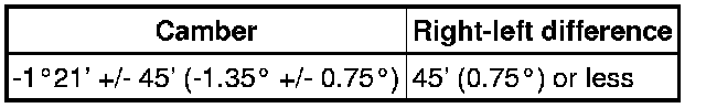 Camber is not adjustable. If the measurement is not within the specification range, inspect the suspension parts for damage and/or wear, and replace them if necessary.