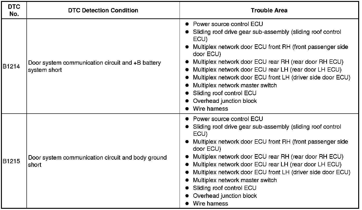 MULTIPLEX COMMUNICATION: MULTIPLEX COMMUNICATION SYSTEM: B1214, B1215: Short to B+ in Door System Communication Bus Malfunction