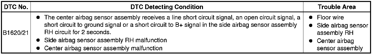 DTC B1620/21 is recorded when a malfunction is detected in the side airbag sensor assembly RH circuit.