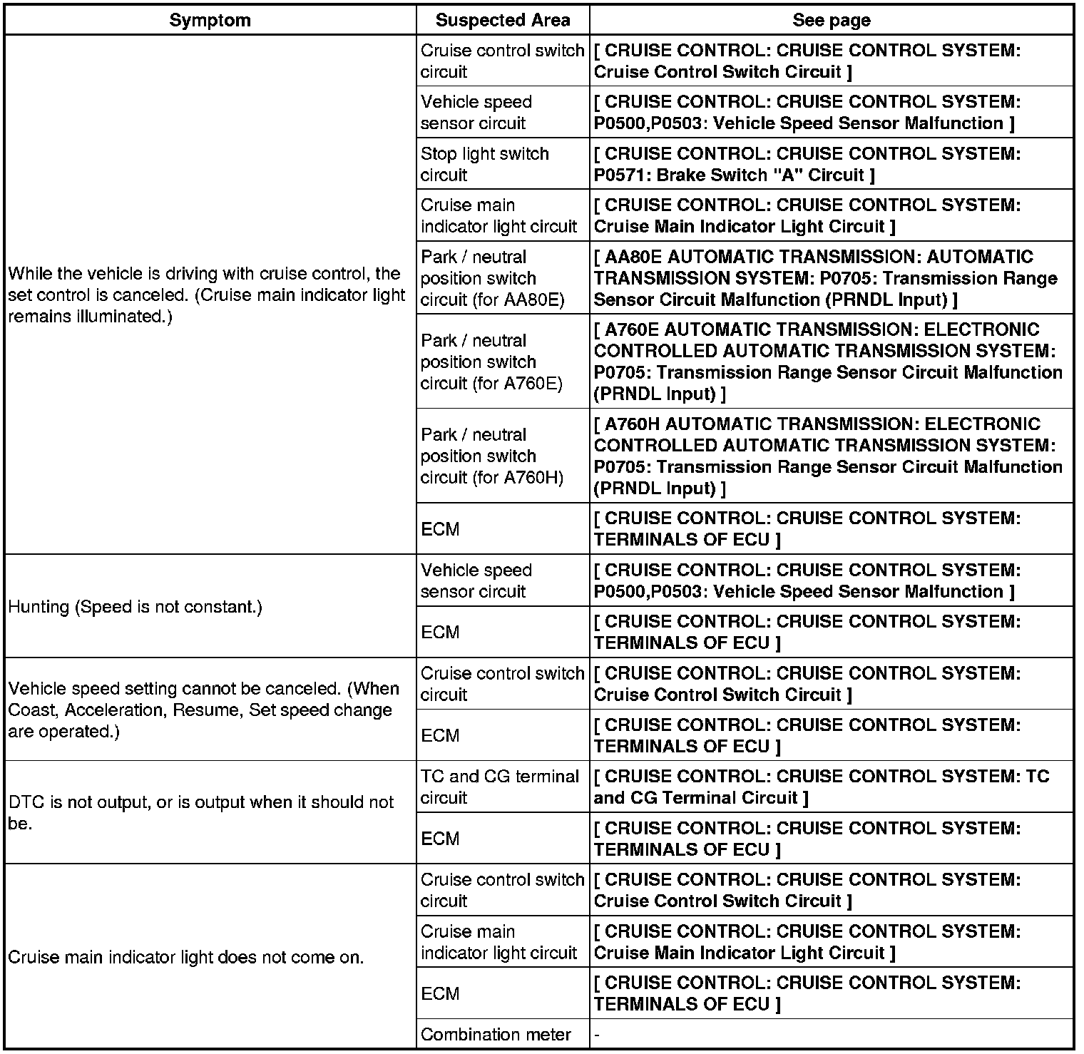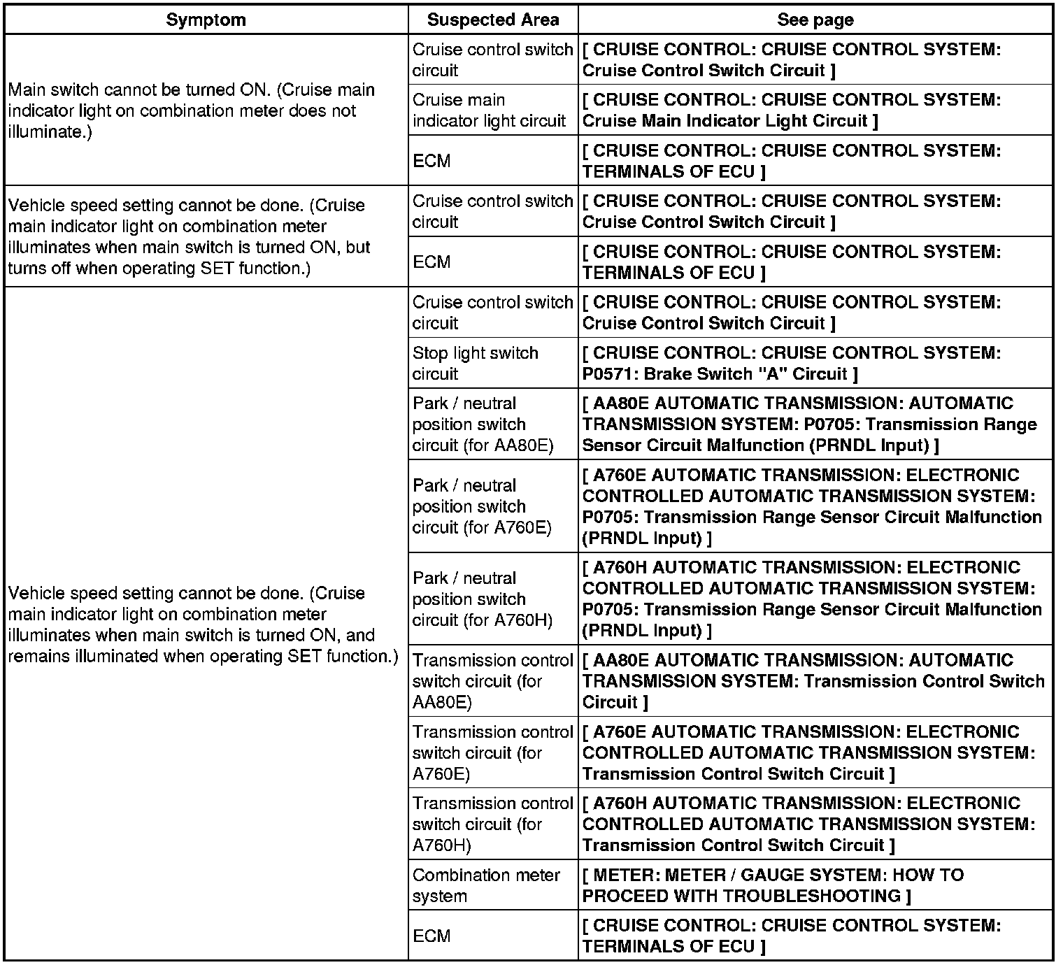 CRUISE CONTROL: CRUISE CONTROL SYSTEM: PROBLEM SYMPTOMS TABLE