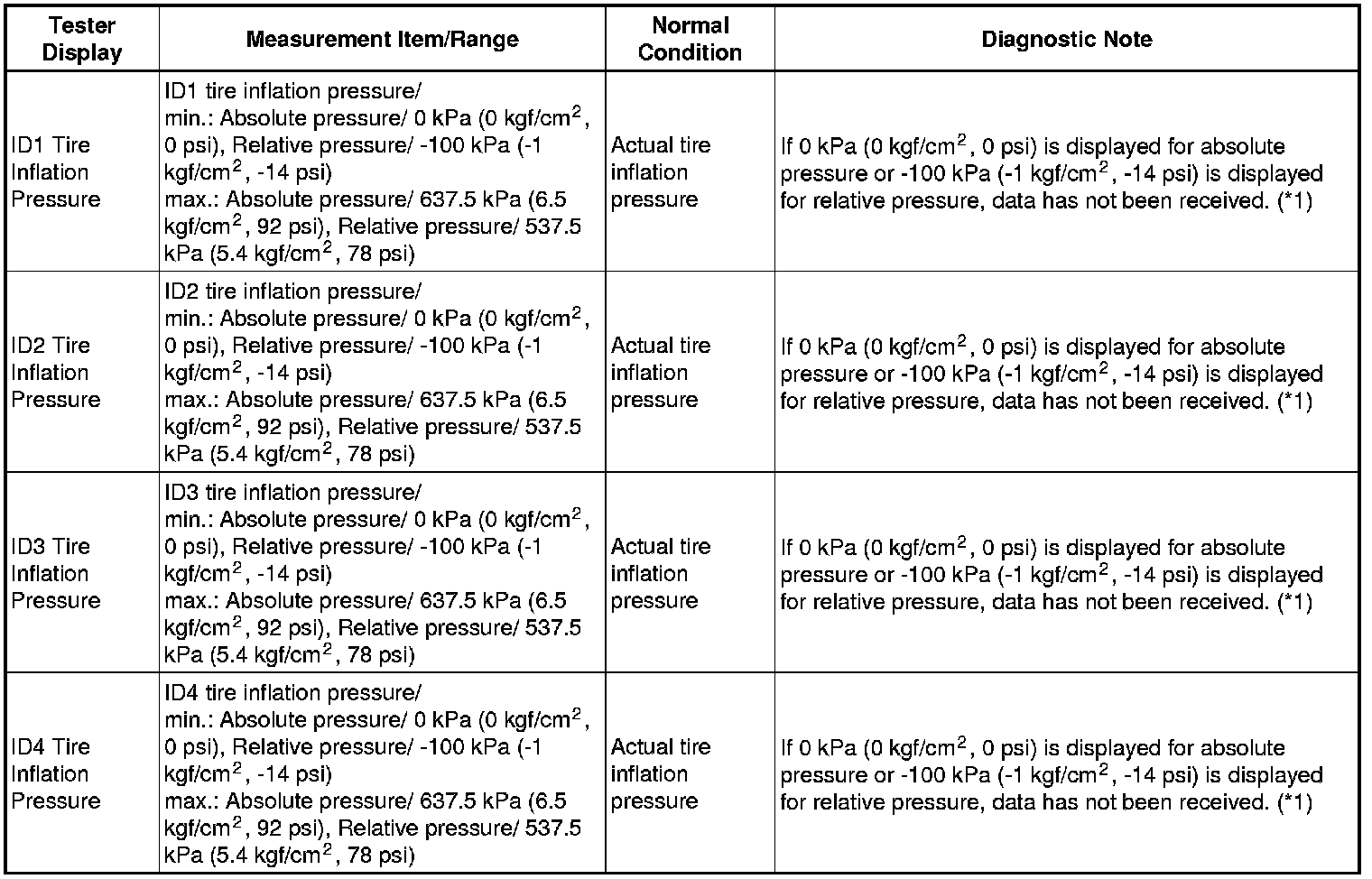 * The initialization is complete when the Data List "ID Tire Inflation Pressure" display shows the correct pressures.