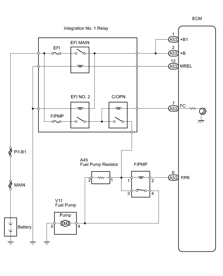 Based on vehicle driving conditions, the ECM operates the fuel pump. The ECM receives an engine start request signal from the power source control ECU. When the engine is started, an NE signal is sent to the ECM and the ECM connects the FC circuit to the body ground, operates the C/OPN (circuit opening) relay, and operates the fuel pump.