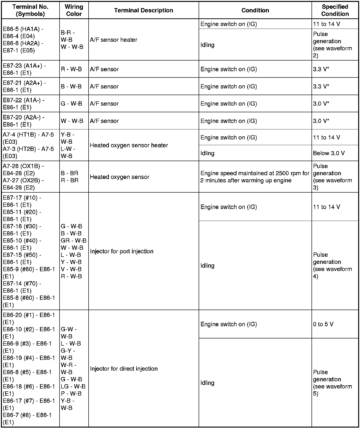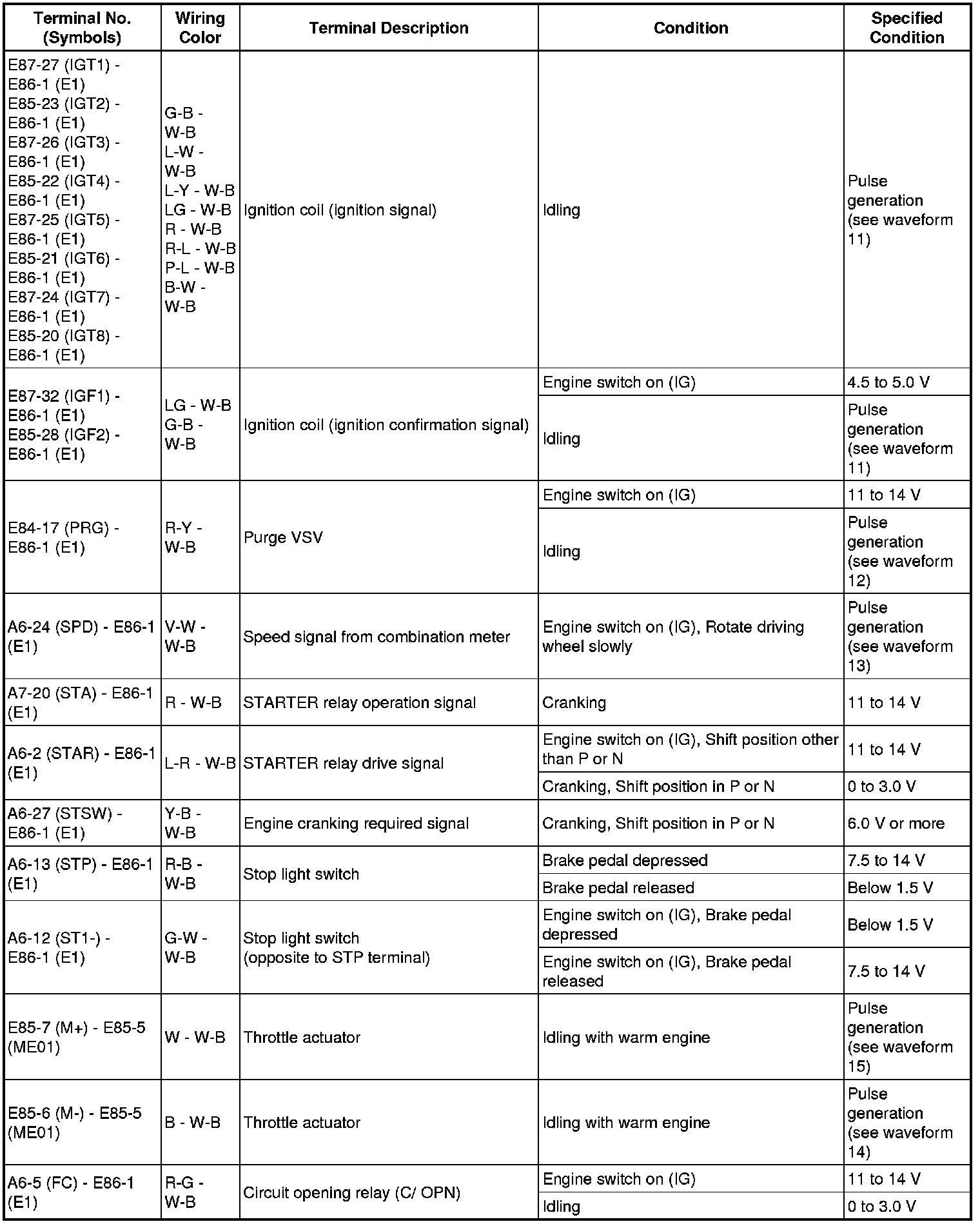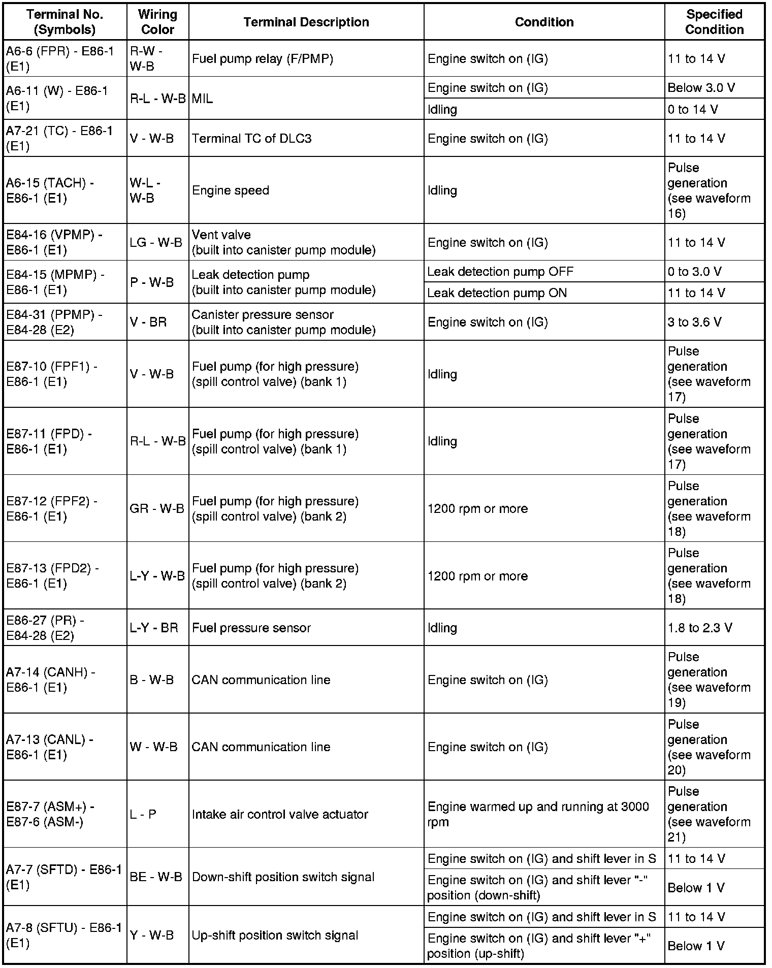 The standard normal voltage between each pair of the ECM terminals is shown in the table below. The appropriate conditions for checking each pair of the terminals are also indicated. The result of checks should be compared with the standard normal voltage for that pair of terminals, displayed in the Specified Condition column. The illustration above can be used as a reference to identify the ECM terminal locations.