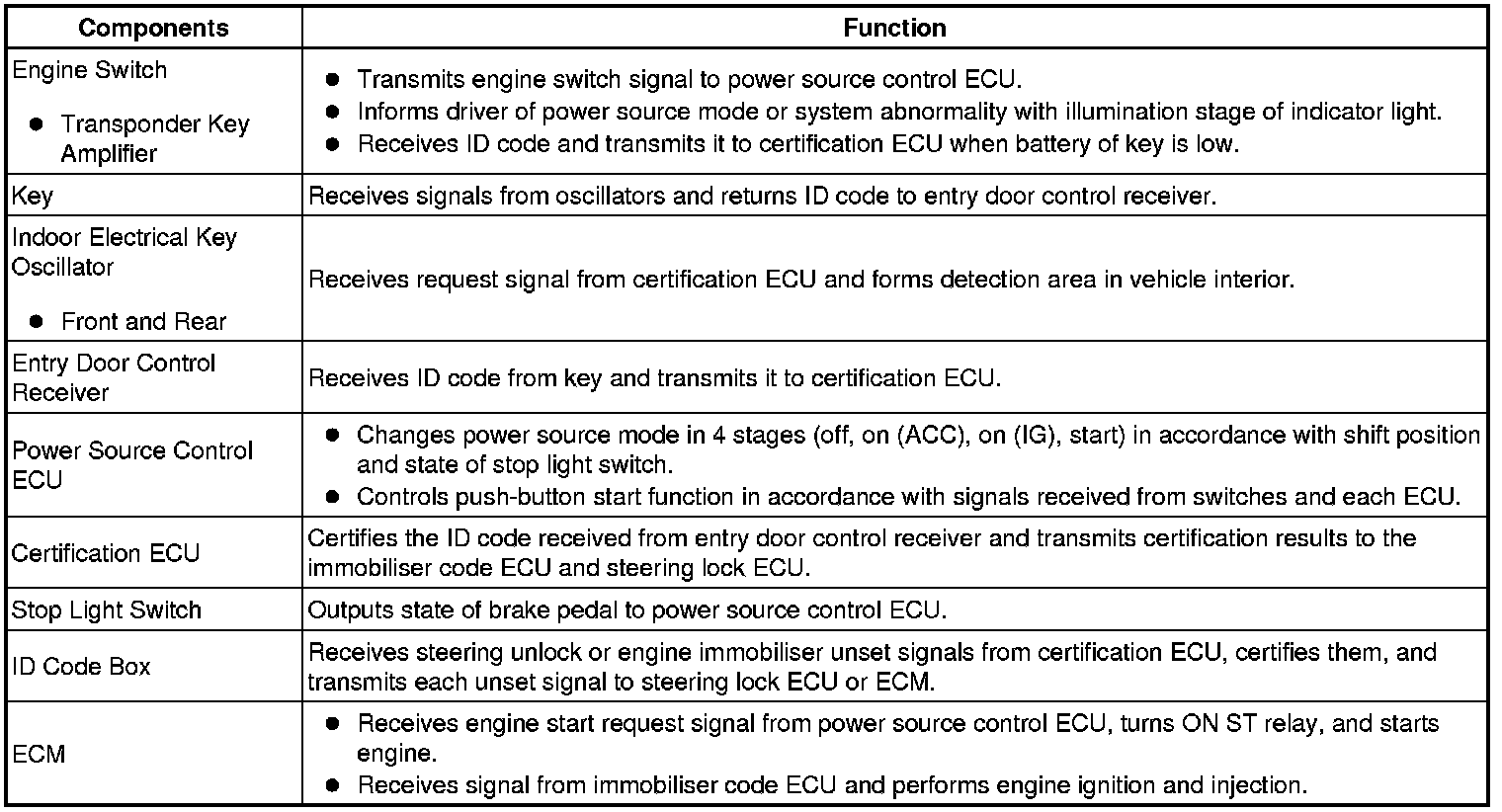 (a) The push-button start uses a push-type engine switch, which the driver can operate by merely carrying the key. This system consists primarily of the power source control ECU, engine switch, ID code box, steering lock ECU, key, ACC relay, IG1 relay, IG2 relay and certification ECU. The power source control ECU controls the system. This function operates in cooperation with the smart access system with push-button start. The table below shows the transition of the engine switch, which depends on whether the brake pedal is depressed or released.