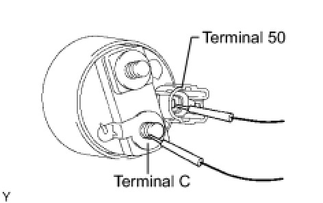 (1) Disconnect the negative (-) terminal lead from terminal C while maintaining the condition specified for the pull-in test above. Check that the pinion gear remains out.