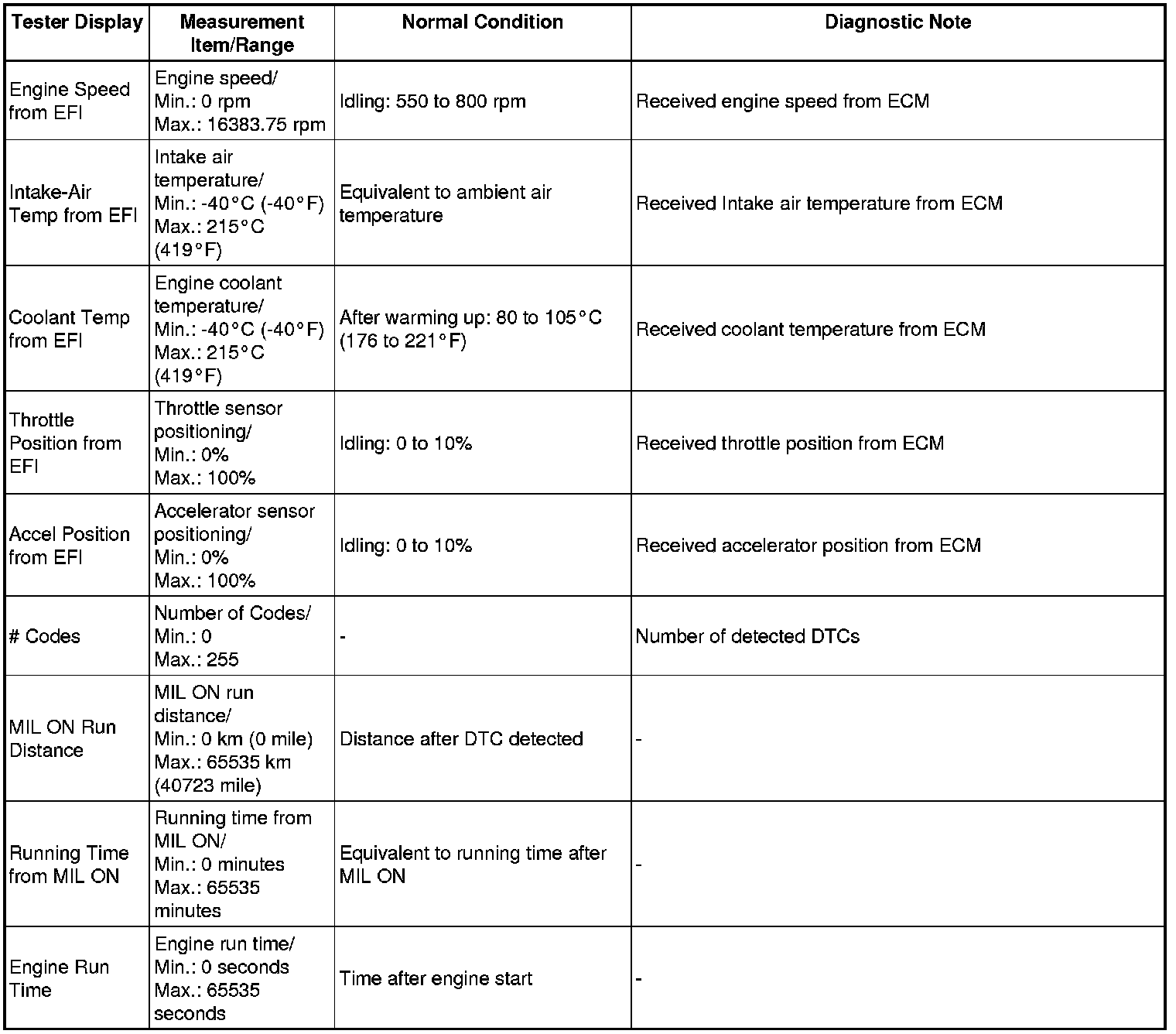 In the table below, the values listed under "Normal Condition" are reference values. Do not depend solely on these reference values when deciding whether a part is faulty or not.