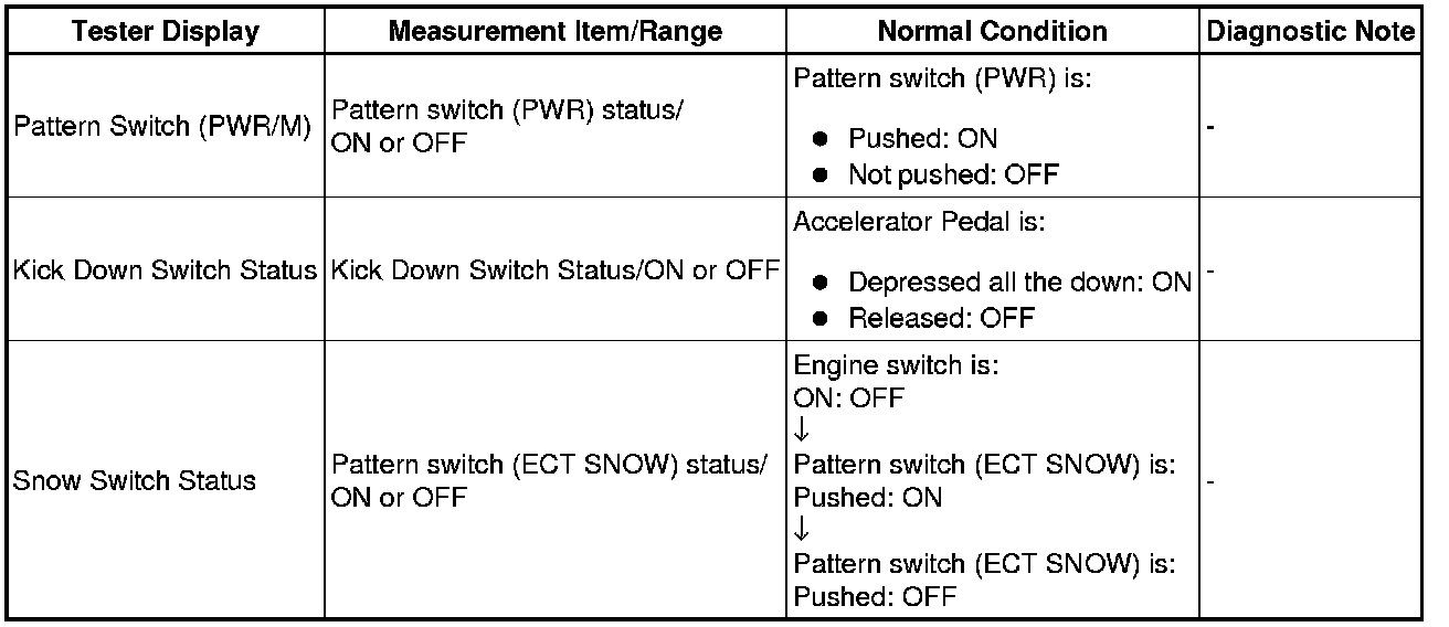 Using the Techstream to read the Data List allows the values or states of switches, sensors, actuators and other items to be read without removing any parts. This non-intrusive inspection can be very useful because intermittent conditions or signals may be discovered before parts or wiring is disturbed. Reading the Data List information early in troubleshooting is one way to save diagnostic time.