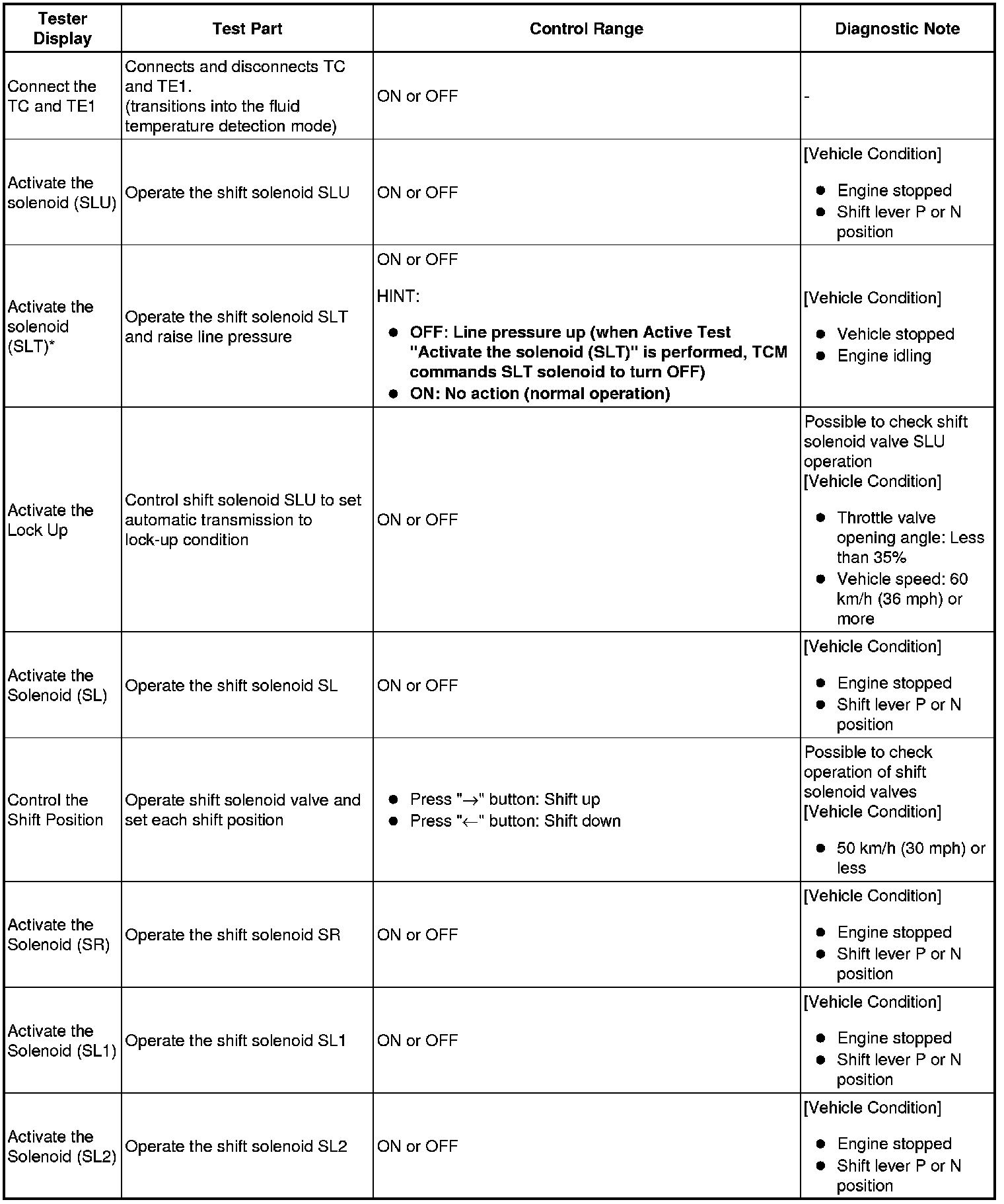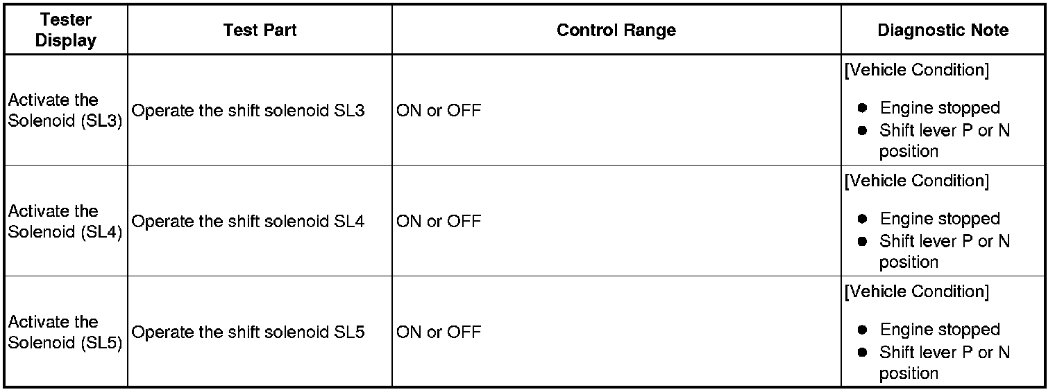 *: "Activate the solenoid (SLT)" in the Active Test is performed to check the line pressure changes by connecting SST to the automatic transmission, which is used in the HYDRAULIC TEST Hydraulic Test as well. Please note that the pressure values in the Active Test and HYDRAULIC TEST are different.
