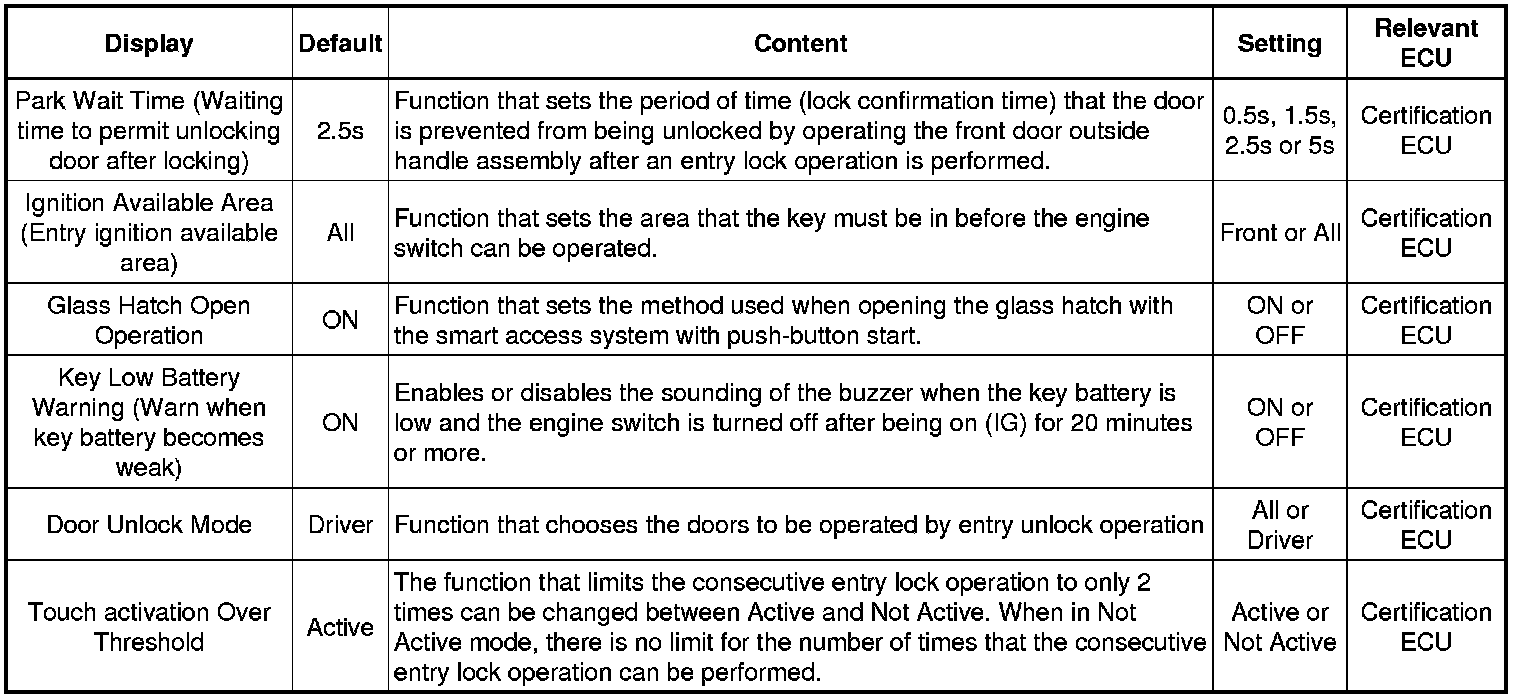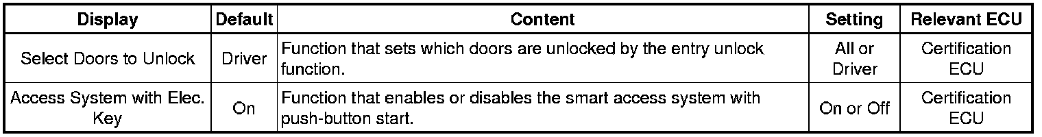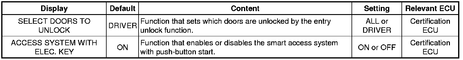 THEFT DETERRENT / KEYLESS ENTRY: SMART ACCESS SYSTEM WITH PUSH-BUTTON START (for Entry Function): CUSTOMIZE PARAMETERS