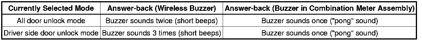 * The answer-back (wireless buzzer, buzzer in the combination meter assembly) performed for each mode is indicated in the table below.