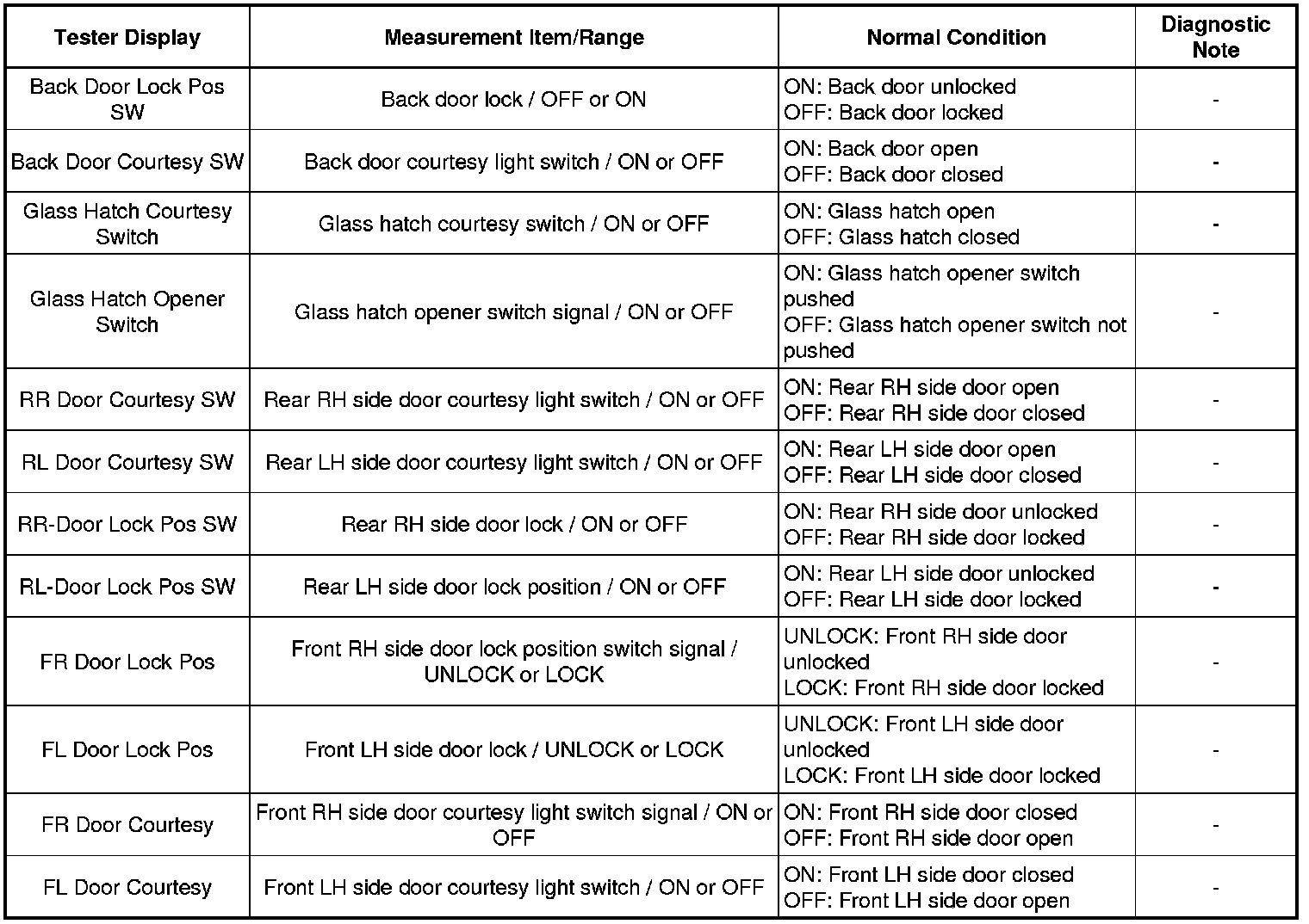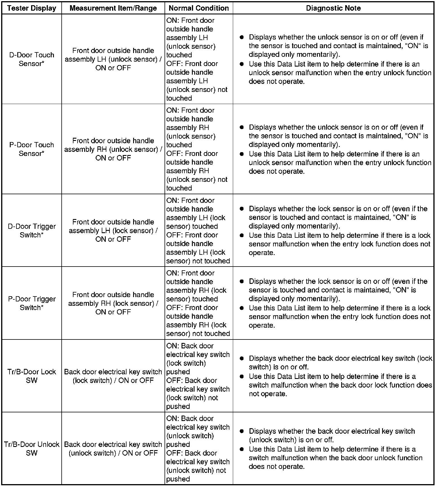 * *3: With engine switch off, all doors closed, key not inside vehicle and all doors unlocked, front door outside handle assembly RH (lock sensor) touched.