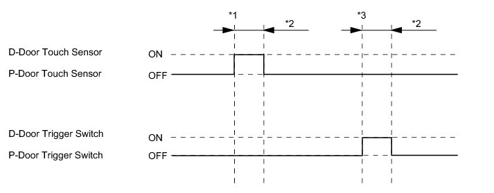 * *1: With engine switch off, all doors closed, key not inside vehicle and all doors unlocked, front door outside handle assembly LH (lock sensor) touched.