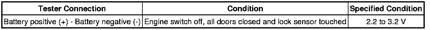 * When measuring the battery voltage, bring the electrical key transmitter within the lock entry operating range while operating the lock sensor of a door handle to perform the measurement. For the entry lock operating range, refer to System Description Smart Access System With Push-Button Start (for Entry Function).