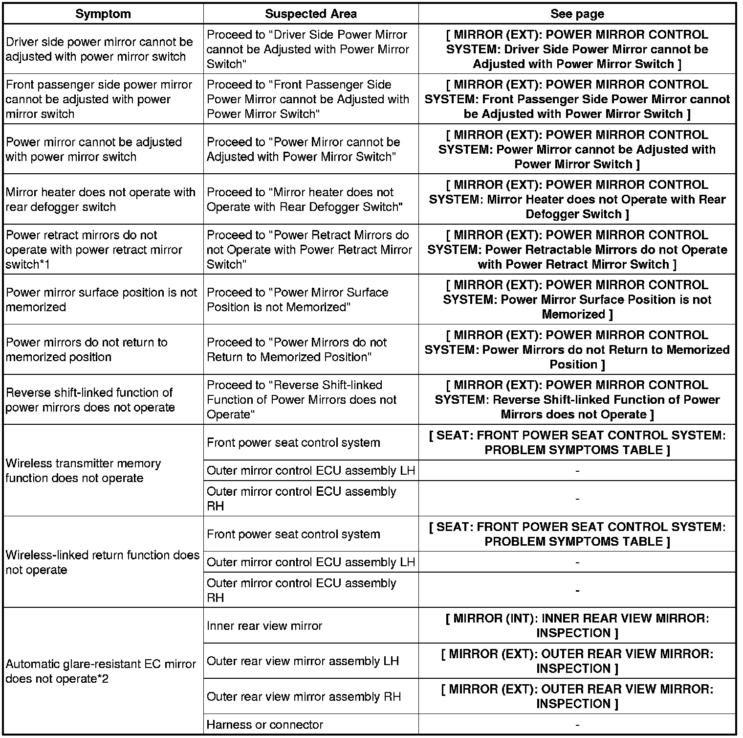 MIRROR (EXT): POWER MIRROR CONTROL SYSTEM: PROBLEM SYMPTOMS TABLE