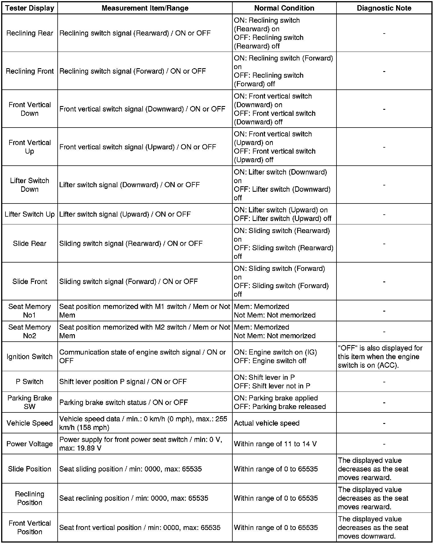 SEAT: FRONT POWER SEAT CONTROL SYSTEM: DATA LIST / ACTIVE TEST