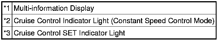 When tapping down the cruise control switch to -SET (for approximately 0.6 seconds) while the constant speed control mode is in operation, the stored vehicle speed decreases by approximately 1.6 km/h (1 mph). When the cruise control switch is pushed to -SET and the difference between the driving and stored vehicle speed is more than 5 km/h (3 mph), the vehicle speed is stored and constant speed control is maintained.