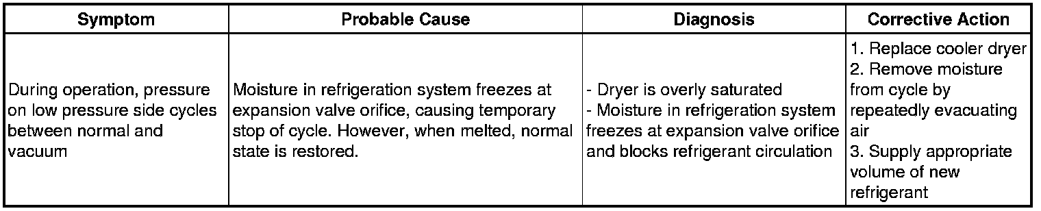 (2) The A/C system periodically changes between normal and improper function due to moisture in the refrigerant system.