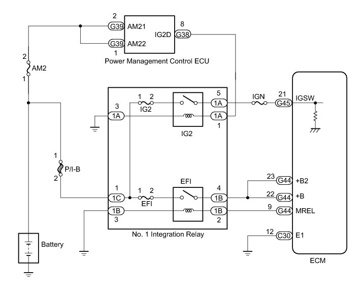 When the engine switch is turned on (IG), the battery voltage is applied to the IGSW terminal of the ECM. The output signal from the MREL terminal of the ECM causes a current to flow to the coil of the No. 1 integration relay (EFI relay), closing the contacts and supplying power to terminals +B and +B2 of the ECM.