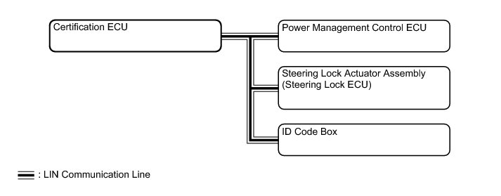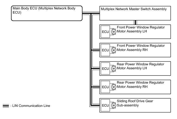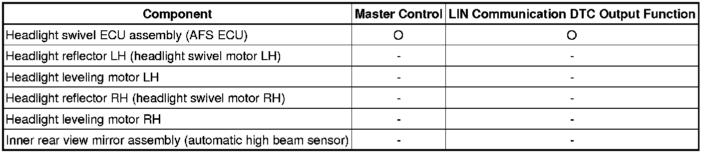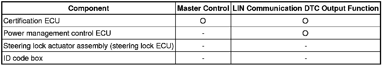 The LIN communication system is used for communication between the components in the tables below. If communication cannot be performed through LIN communication because of a break in the communication lines or some other reason, the master control ECU of the relevant system stores DTCs. Refer to the table below about the communication bus lines and connected components.