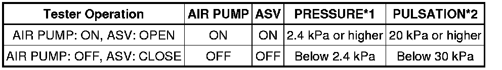 (h) Check that the air pump (AIR PUMP), ASV and pressure in the AIR system passage (PRESSURE) status displayed on the Techstream indicate the conditions shown in the table below.