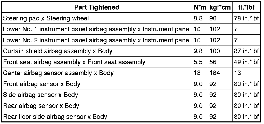 SPECIFICATIONS: SUPPLEMENTAL RESTRAINT SYSTEMS: TORQUE SPECIFICATIONS