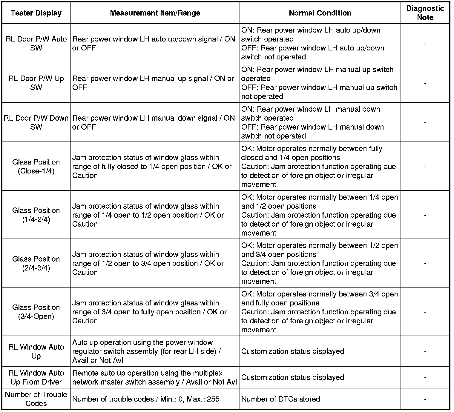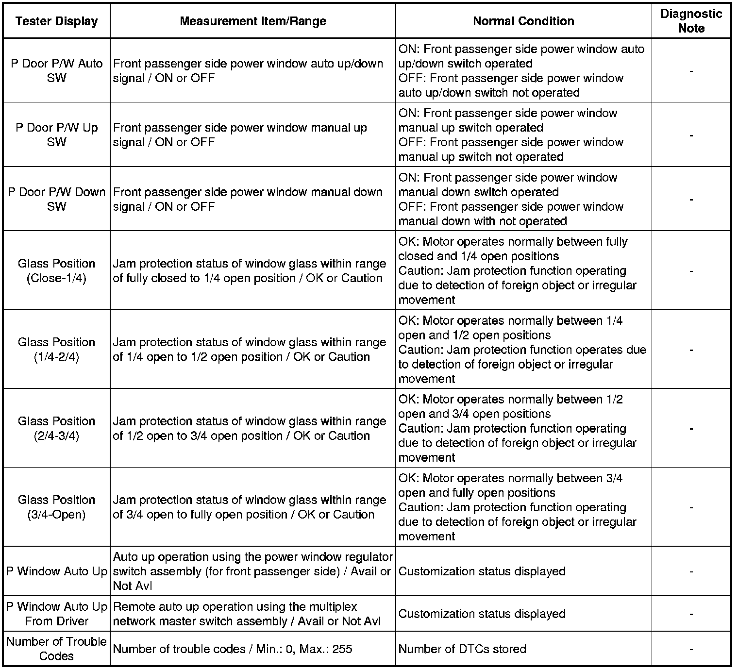 WINDOW / GLASS: POWER WINDOW CONTROL SYSTEM: DATA LIST / ACTIVE TEST