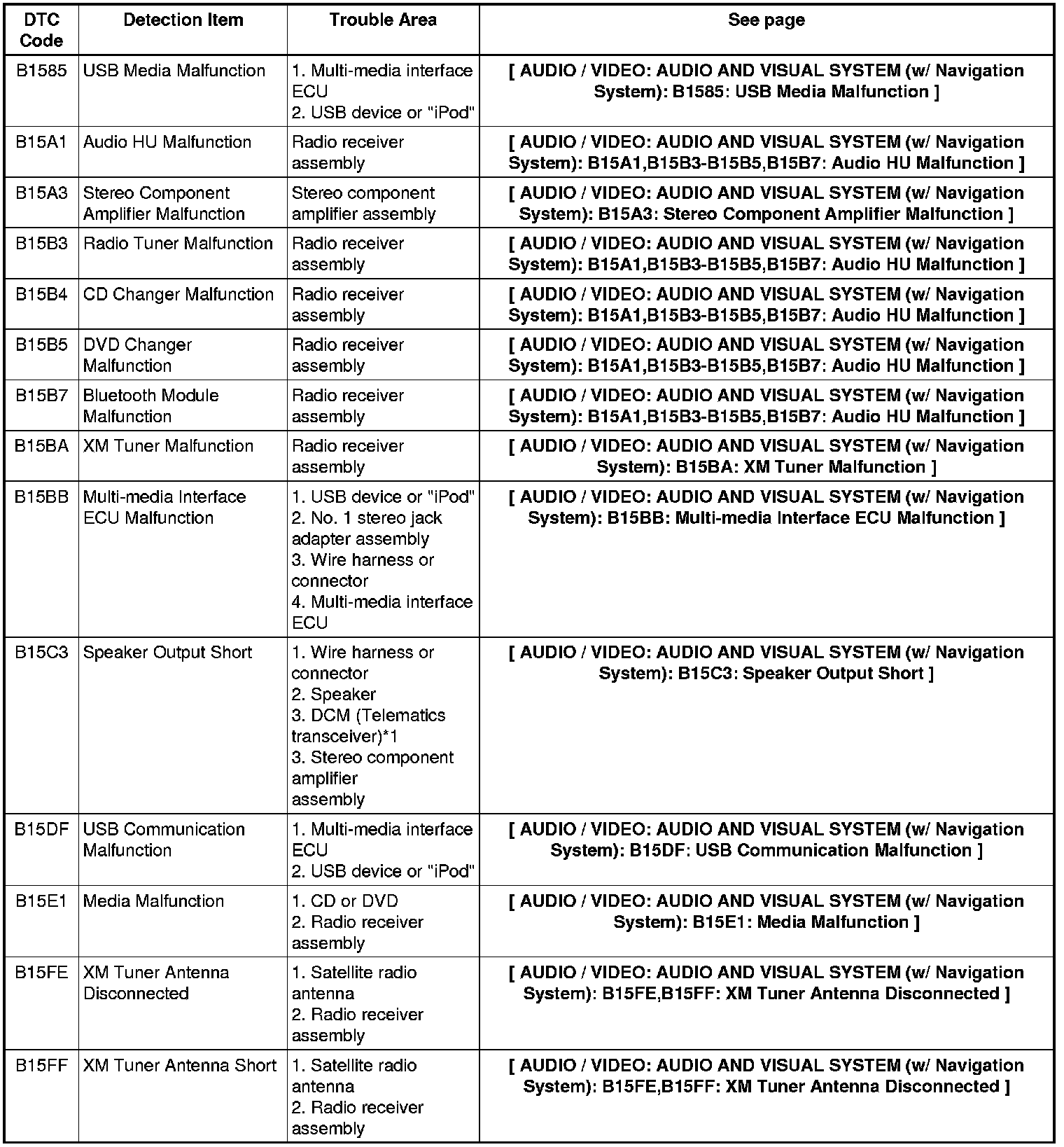 AUDIO / VIDEO: AUDIO AND VISUAL SYSTEM (w/ Navigation System): DIAGNOSTIC TROUBLE CODE CHART