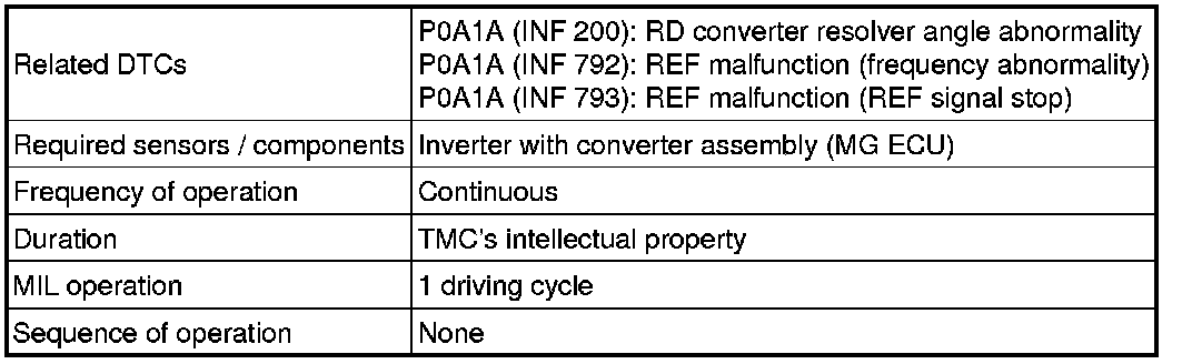 The MG ECU performs many diagnostic tests to verify proper operation of internal ECU systems. In this diagnostic monitor, the MG ECU checks for an R/D (Resolver/Digital Converter) malfunction involving the generator resolver. If MG ECU detects an R/D error, it will conclude that there is an internal malfunction involving the generator resolver. The hybrid vehicle control ECU will illuminate the MIL and set a DTC.