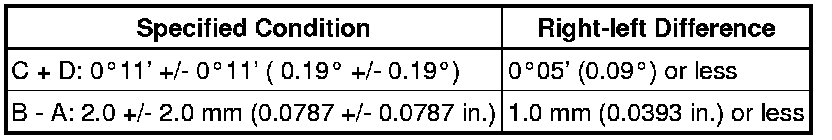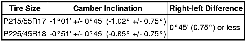 Camber is not adjustable. If the measurement is not within the specified range, inspect the suspension parts for damage and/or wear, and replace them if necessary.